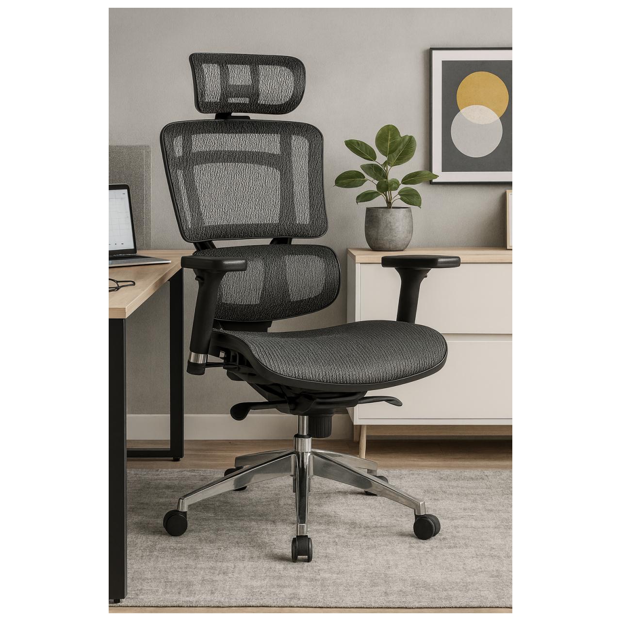 • Apoio de cabeça em tela mesh ajustável em altura e inclinação, permitindo adaptação perfeita ao usuário.